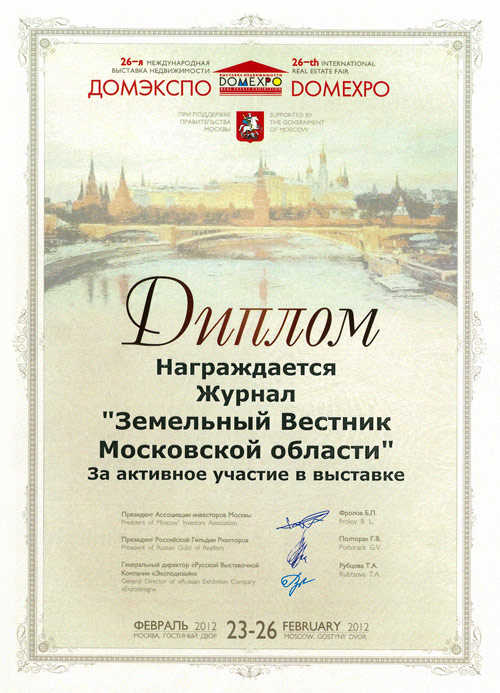Диплом за активное участие в выставке «ДОМЭКСПО»,