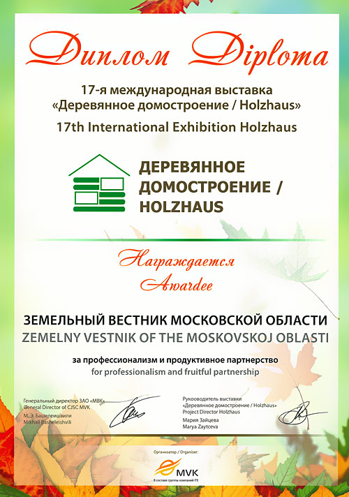 Диплом за участие в выставке «Деревянное домостроение» / Holzhaus, ноябрь 2012 г.