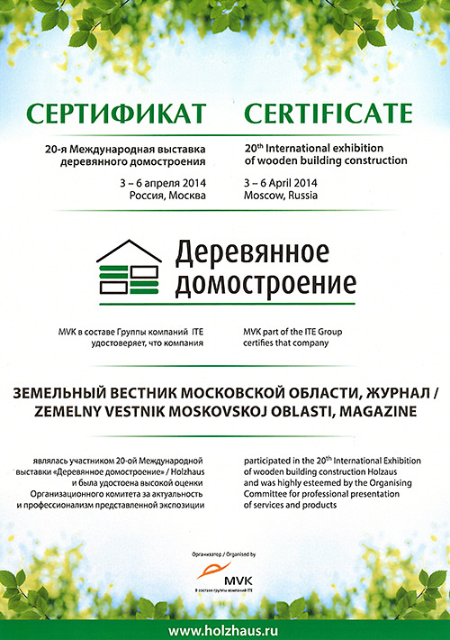 Сертификат участника выставки «Деревянное домостроение» / Holzhaus, апрель 2014 г.